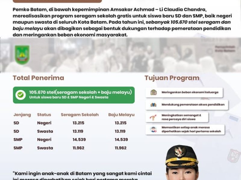 Melansir dari laman batam.go.id, program ini menyasar total 105.670 stel seragam sekolah dan baju melayu, sebagai bentuk komitmen nyata Pemko Batam dalam meringankan beban ekonomi masyarakat serta mendukung pemerataan akses pendidikan yang layak bagi seluruh pelajar di Batam.